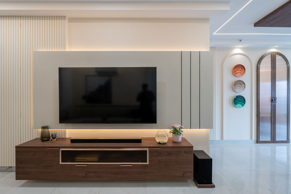 Introducing Poulomi Avante, a 3BHK home offering a modern sophisticated look with neutral shades of beige as a base canvas, rich walnut wooden finishes, black wooden textures, and luxurious metallic accents. This house in Kokapet features expansive glass and mirrors, creating a contemporary and glamorous ambiance with hints of muted greens and blues in artworks, wallpaper and furniture for a touch of elegance. The use of glass and mirrors finishes makes it a very expansive, luxurious, and contemporary home. It is a home designed using clean lines and forms yet the finishes chosen make it a glamorous abode.